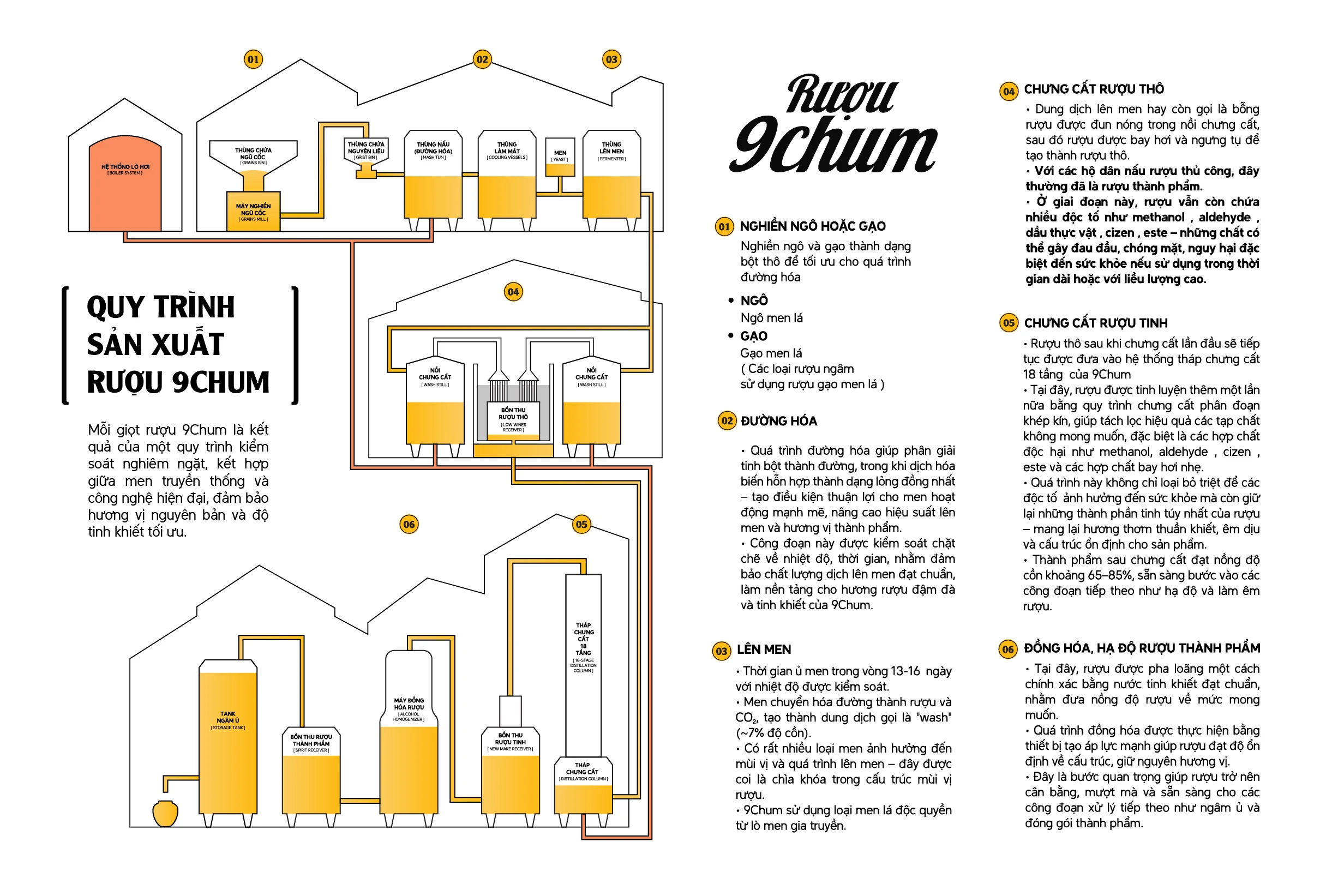 Rượu 9Chum được sản xuất bằng công nghệ chưng cất phân đoạn trên tháp 18 tầng, cho phép loại bỏ triệt để các tạp chất gây hại như methanol, aldehyde, cizen, este và các hợp chất bay hơi khác.